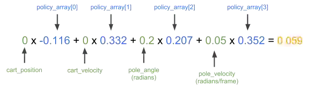 为了解决推车游戏,我们希望所设计的机器学习策略能够赢得游戏或最大化游戏奖励。对于智能体而言,这里将接收4维数组所表示策略,每一维代表每个组成的重要性 (推车的位置,杆位等四个组成)。随后,再将点积的结果与策略、状态向量进行处理并输出最终的结果。根据结果的正负值决定是向左还是向右推动推车。这听起来可能有点抽象,下面就通过一个具体的例子,来看看整个过程将发生什么。