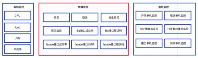 目前虾米的监控分为故障监控、基础监控和通用监控三类,如下图所示:
