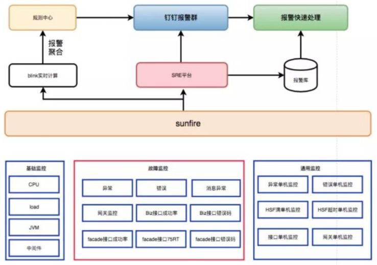 前面两种类型的监控已经基本可以定位到故障是否由于程序 Bug、上游应用或单机故障引起的,还有一类就是对中间件的监控,这里我们利用了 Sunfire 的基础监控对应用的 CPU、Load、JVM、HSF(Dubbo)、MetaQ 等中间件的各项指标进行监控。如果因为中间件故障,此处将会有明显的报警。