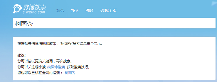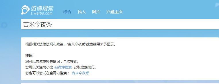 在微博输入“柯南秀”、“吉米秀”、“周六夜现场”等都已显示无效,包含这些关键字的相关微博账号也是显示“根据相关法律法规和政策,搜索结果未予显示。”