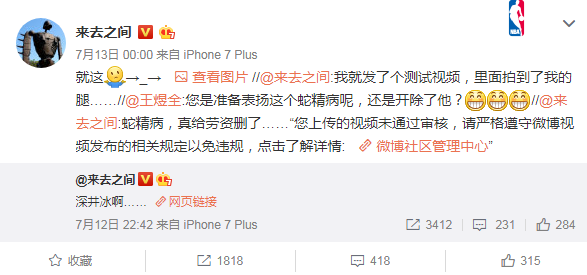 与此同时,微博方面虽然表示非节目类视频不受影响,但其对用户上传内容的审核力度也在不断加大。日前,微博CEO王高飞吐槽自己发段视频拍到了自己的腿就被删除了,笑骂其“蛇精病”。