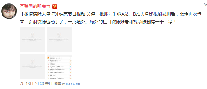 【TechWeb报道】7月14日消息,随着A站、B站大量海外影视剧被下架,有网友发现新浪微博上的一些海外综艺节目也被清除,搜索结果显示的是“根据相关法律法规和政策,搜索结果未予显示。”