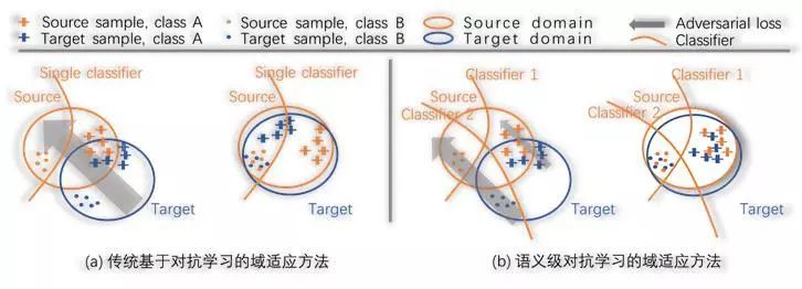 针对这一问题,我们在今年CVPR的论文中,向对抗学习框架里加入了联合训练的思想,解决了传统域适应方法中的语义不一致性和负迁移等键问题。具体做法见图2(b),我们采用了两个互斥分类器对目标域特征进行分类。当两个分类器给出的预测很一致时,我们认为该特征已经能被很好的分类,语义一致性较高,所以应减少全局对齐策略对这些特征产生的负面影响。反之,当两个分类器给出的预测不一致,说明该目标域特征还未被很好地分类,依然需要用对抗损失进行与源域特征的对齐。所以应加大对齐力度,使其尽快和源域特征对应。