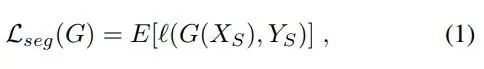 图3中,橙色的线条表示源域流,蓝色的线条表示目标域流,绿色的双箭头表示我们在训练中强迫两个分类器的参数正交,以达到互斥分类器的目的。源域流和传统的方法并无很大不同,唯一的区别是我们集成了互斥分类器产生的预测作为源域的集成预测。该预测一方面被标签监督,产生分割损失(Segmentation Loss),如式(3)所示: