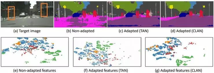 我们重点关注不常见类,如图4(a)中黄框内的柱子,交通标志。这些类经过传统方法的分布对齐,反而在分割结果中消失了。结合特征的t-SNE图,我们可以得出结论,有些类的特征在没有进行域迁移之前,就已经是对齐的。传统的全局域适应方法反而会破坏这种语义一致性,造成负迁移。而我们提出的语义级别对抗降低了全局对齐对这些已对齐类的影响,很好的解决了这一问题。
