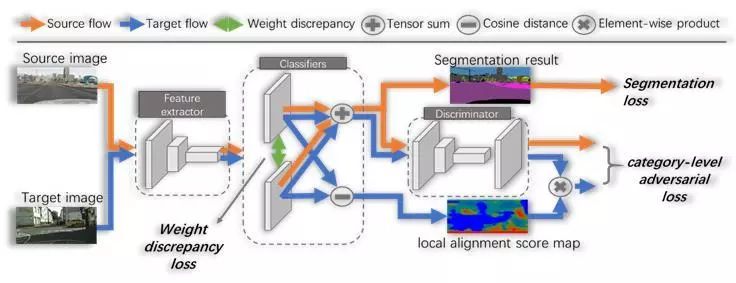 为了实现上述语义级对抗目标,我们提出了Category-Level Adversarial Network (CLAN)。 遵循联合训练的思想,我们在生成网络中采用了互斥分类器的结构,以判断目标域的隐层特征是否已达到了局部语义对齐。在后续对抗训练时,  网络依据互斥分类器产生的两个预测向量之差(Discrepancy)来对判别网络所反馈的对抗损失进行加权。网络结构如下图3所示。