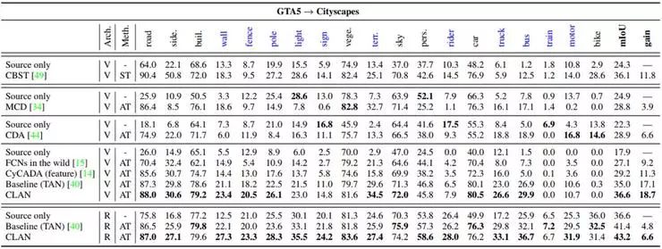 表 1. 由虚拟数据集GTA5 迁移至真实数据集 Cityscapes 的域适应分割精度对比。