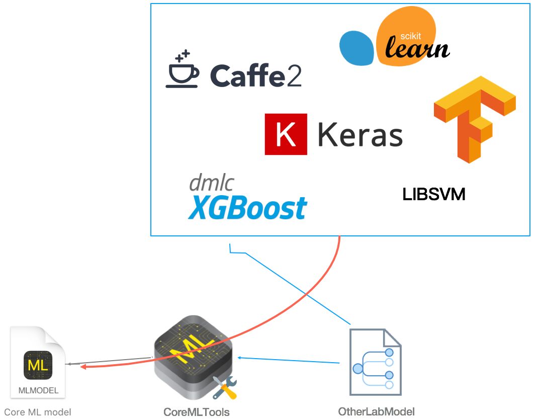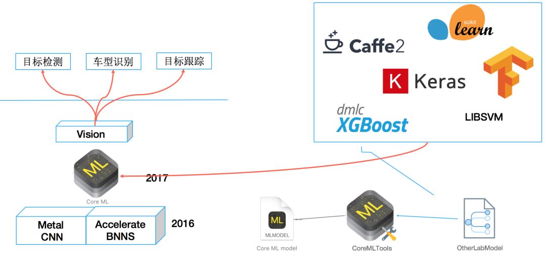 第一点就是刚刚提到的将一些比较出名的开源机器学习工具(如Keras、Caffe、scikit-learn、libsvm、XGBoost)训练出来的模型文件转换为.mlmodel。