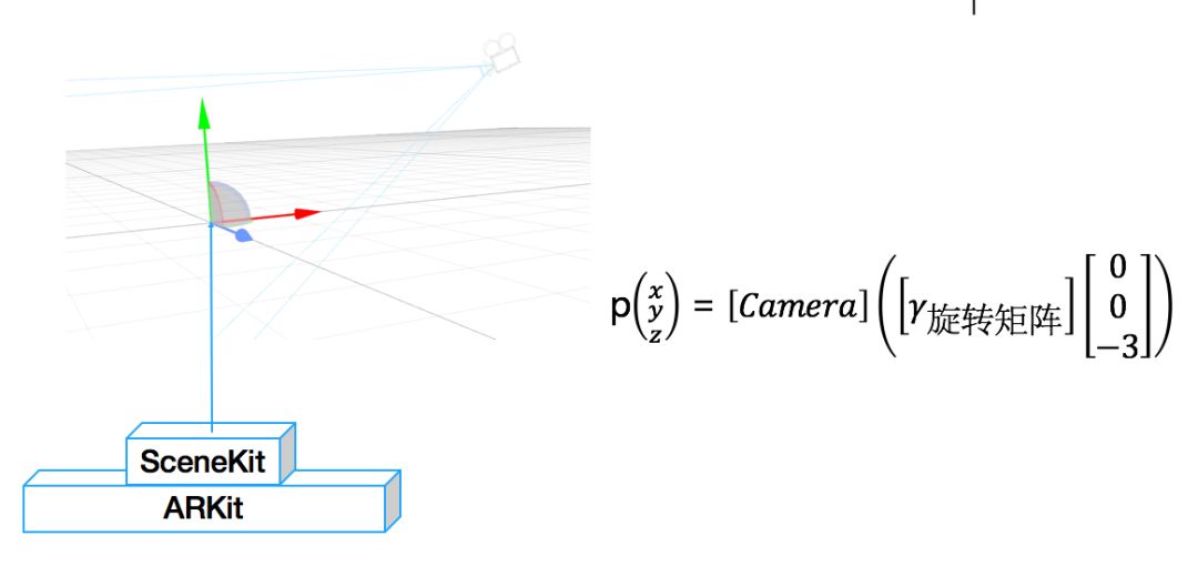 那么问题来了,如何将一个3D模型显示在屏幕正中央γ处呢?这里就用到了ARKit的ARSCNView中的模型渲染API,跟OpenGL类似,ARSCNView从创建之初会设置一个3D世界原点并启动摄像头,随着手机的移动,摄像头相当于3D世界中的一个眼睛,可以用一个观察矩阵[camera]表示。