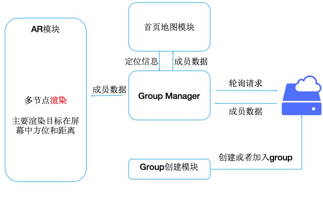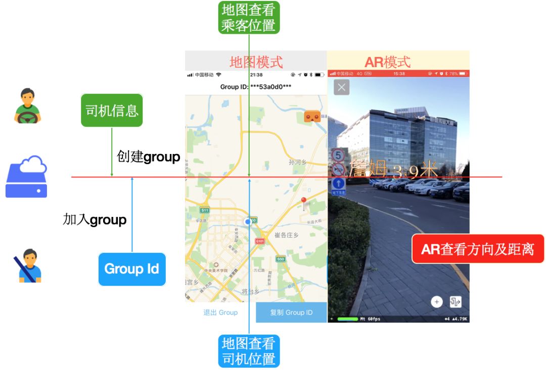 很快我们就把上面的想法落地实现了,开发了一个叫做WhereAreYou的简单App应用,相当于AR版本的微信共享位置,只要打开摄像头就可以看到小伙伴们的方位和远近。当然了,应用于打车场景下,就是让用户知道目标车辆从何驶来、距离多远。程序大概结构如图一所示: