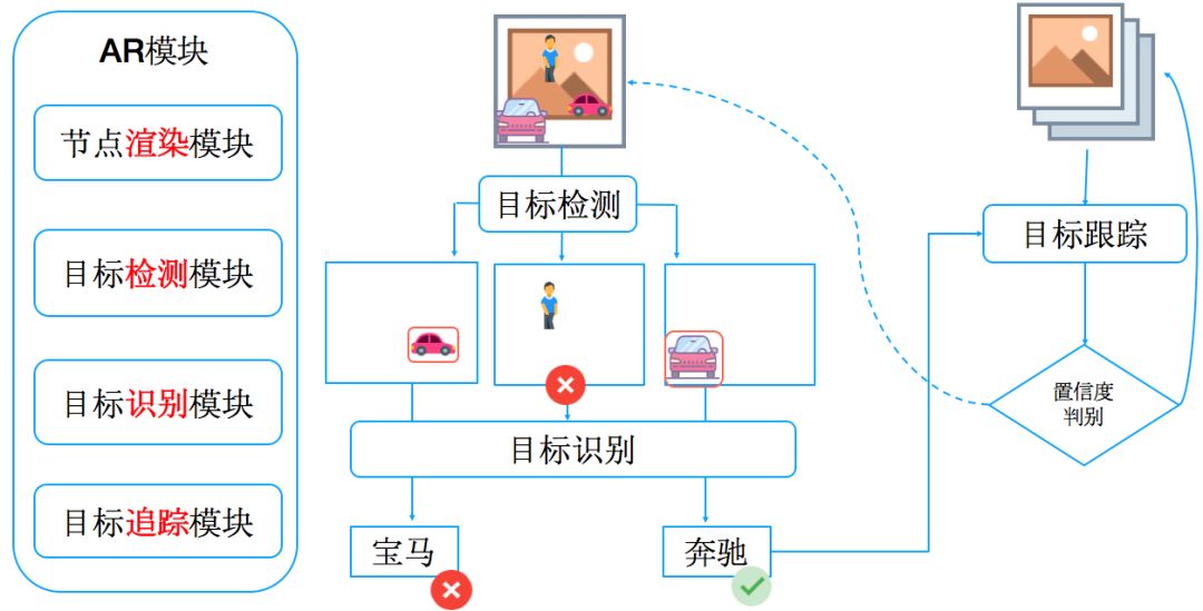 我们筛选所有汽车目标,将对应物体的图片截取后送入目标识别模块,对车型进行识别。之后拿到识别出的车型跟车主上传的车型进行对比,如果车主的车型跟识别出的结果一致,就将当前帧和目标区域送入目标跟踪模块,并对当前车辆进行持续跟踪。当然如果跟踪失败就从头进行整个过程。具体如图十所示: