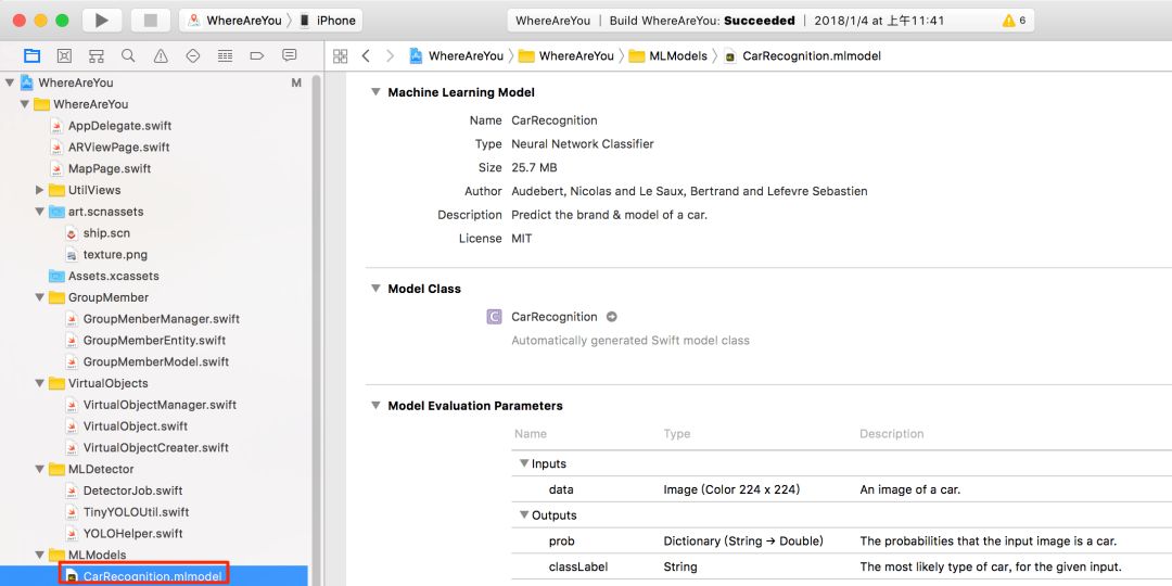import coremltools# 调用caffe转换器的convert方法执行转换coreml_model = coremltools.converters.caffe.convert(('googlenet_finetune_web_car.caffemodel', 'deploy.prototxt'), image_input_names = 'data', class_labels = 'cars.txt')# 设置元数据coreml_model.author = 'Audebert, Nicolas and Le Saux, Bertrand and Lefevre Sebastien'coreml_model.license = 'MIT'coreml_model.short_description = 'Predict the brand & model of a car.'coreml_model.input_description['data'] = 'An image of a car.'coreml_model.output_description['prob'] = 'The probabilities that the input image is a car.'coreml_model.output_description['classLabel'] = 'The most likely type of car, for the given input.'# 保存转换生成的分类器模型文件coreml_model.save('CarRecognition.mlmodel')上面所说的“可以让开发者很容易地在应用中集成机器学习模型”是什么意思呢?是指如果你有一个CarRecognition.mlmodel 文件,你可以把它拖入到Xcode中: