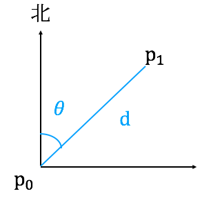 首先考虑空间上的两个点P0、 P1,以P0为原点,横轴代表纬度,纵轴代表经度,这样我们可以求得两点位于正北的偏角θ;
