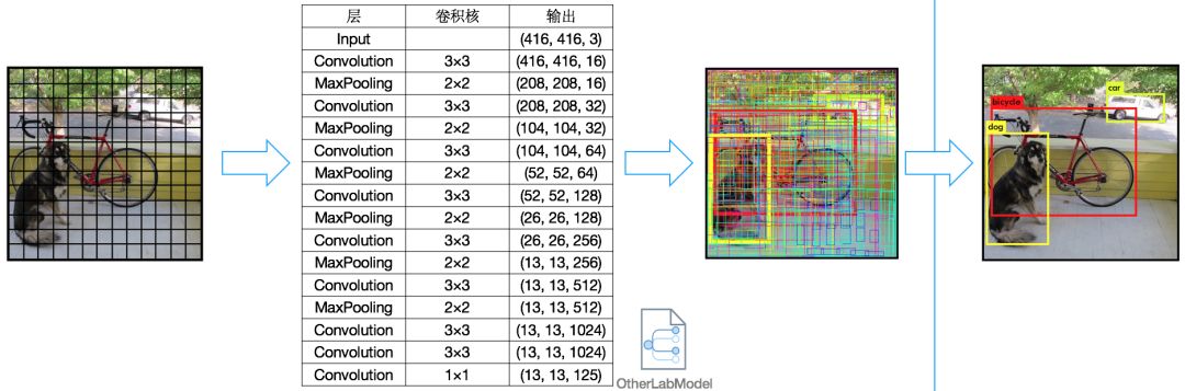 其具体意义是一张图片中所有小块(共13 × 13个)每次预测得到5组结果,每组结果对应一个矩形区域信息(x、y、width、height)代表本小块所属的目标区域,同时给出这个区域确信是一个目标的概率(confidence,这里的“确信是一个目标”是指20种物体任意一个即可),还有 20种物体各自的确信概率。即125 = 5 × 25(x、y、width、height、confidence、Class1Confidence、Class2Cconfidence……)。了解这点后我们就不难截取最终识别结果所对应的图片区域了(当然只选取置信率比较高的前几个)。