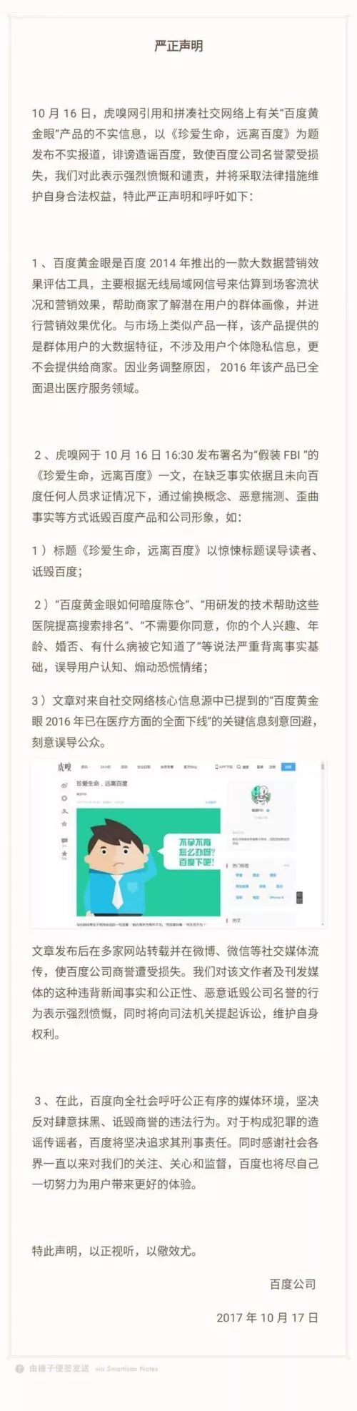 10月17日,百度推广官方微博回应称,“与市场上类似产品一样,该产品提供的是群体用户的大数据特征,不涉及用户个体隐私信息,更不会提供给商家”,并表示“因业务调整原因,2016年该产品已全面退出医疗服务领域。”同时,百度在声明中表示对虎嗅网通过偷换概念、恶意揣测、歪曲事实等方式诋毁百度行文表示强烈愤慨,同时将向司法机关提起诉讼,维护自身权利。