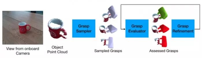 首先,机械手“观察”物体并规划好在6D空间(空间中的x、y、z坐标平面和旋转三维空间)中的移动路径,随后调用该算法,算法生成一组可能的握持器并根据需求进行移动,然后握持器的运行需调用“握持评估器”,该评估器会为每个可能的握持分配一个分数。最后,握持评估器通过局部变换调整握持变量进而提高最佳握持的成功率。