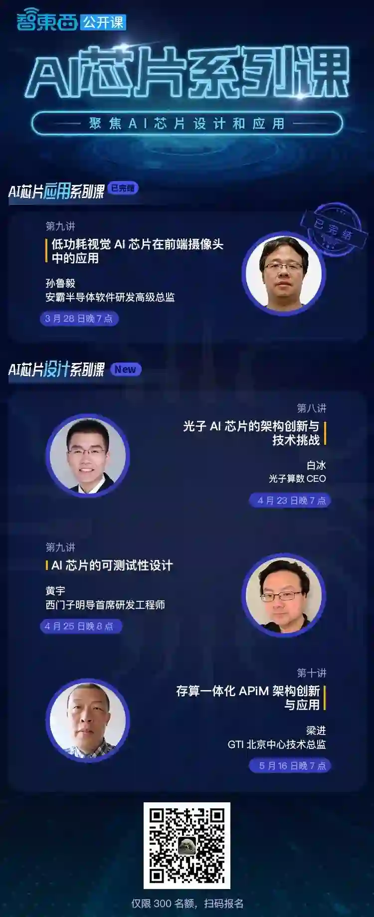 4月AI芯片设计系列课预告!4月23日,第一讲由光子算数CEO白冰主讲;4月25日,第二讲由西门子明导首席研发工程师黄宇主讲。主讲群名额有限,欢迎扫码报名。
