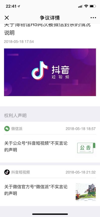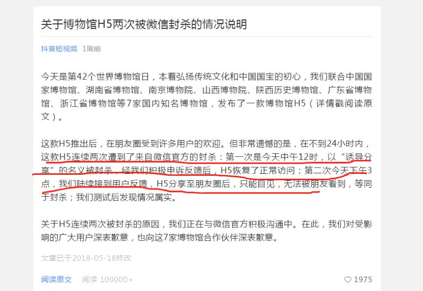 于是,抖音短视频在自己的官号上发了一篇《关于博物馆H5两次被微信封杀的情况说明》,正式开始了喊冤之路。