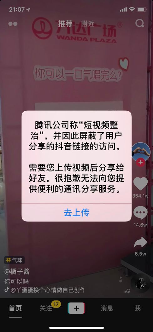 今天,不少吃瓜群众发现在抖音短视频内想要分享视频到微信,会收到这样一条提示: