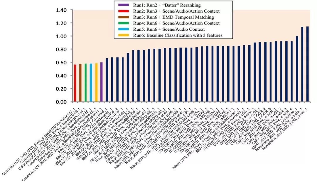 整体上,error 越低越好。彩色的是我在哥伦比亚大学的时候提交的,结果是最好的,error 大概是 50% 多一点。也就是说,超过一半是错的,在这样的情况下,还是排名最好的。所以,大家看到,十年前,视频内容的智能识别技术是相当落后的,没有办法实用。