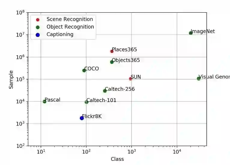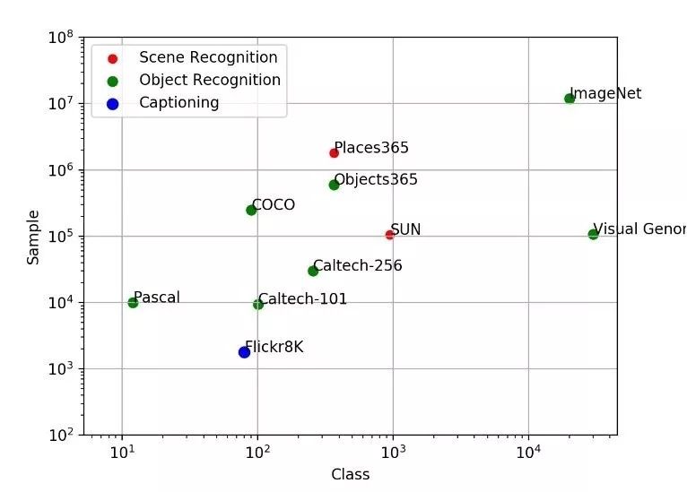 大家看这张图,上面是一些流行的关于图像识别的数据集,横轴是类别的数量,纵轴是样本(图片)的数量。类别和图片数量都很多的,就是 ImageNet。ImageNet 对深度学习在 CV 领域的发展贡献非常大。