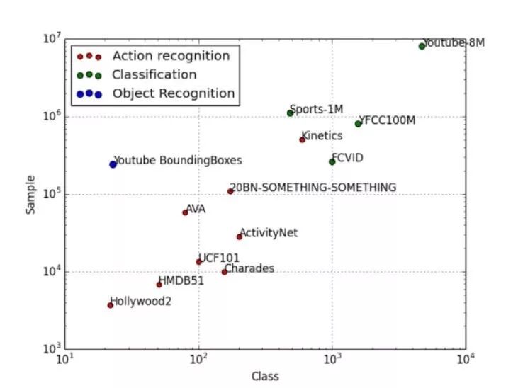 再看这张图,视频领域,现在比较大的数据集就是 YouTube-8M(800 万个 YouTube 视频),是谷歌公布的一个数据集。