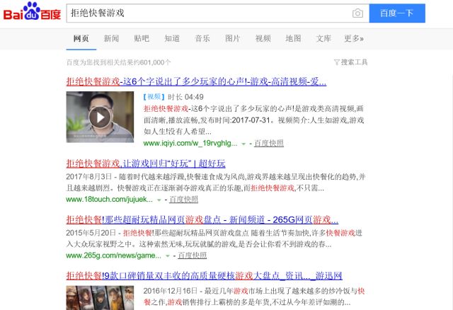通过在百度进行简单的检索比较,我们可以发现,对快餐游戏的拒绝是更加直接、不留情面的。