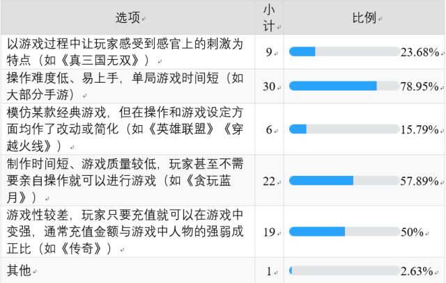从表格中可以看出,最为广泛认可的阐述,是“操作难度低、易上手、单局时间短”。除此之外,超过半数人认为,快餐游戏是质量低、游戏性差、氪金需求高的,是粗制滥造的代名词。