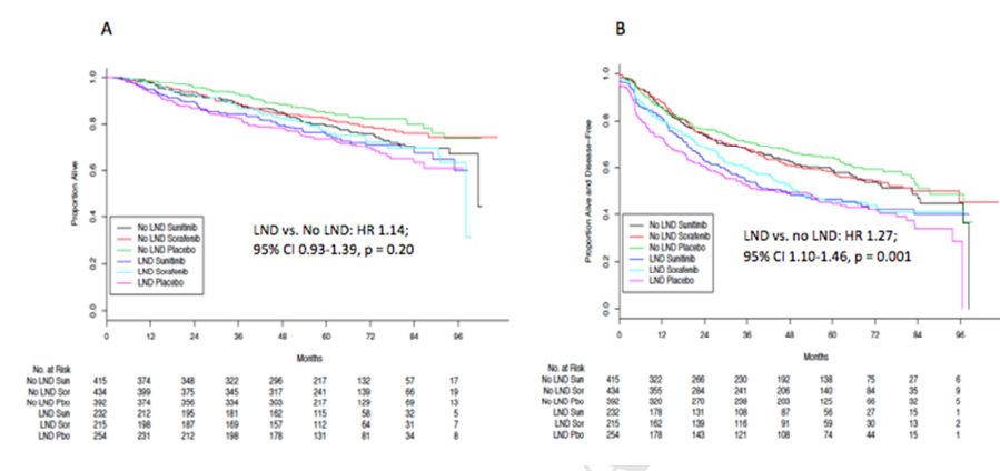 在pN+亚组,5年生存率舒尼替尼(45.7%,P=0.113)或索拉非尼(63.7%,P=0.981)较安慰剂无差异。在pN+亚组,索拉非尼与安慰剂比较中位DFS无差异,但舒尼替尼较安慰剂DFS更差。