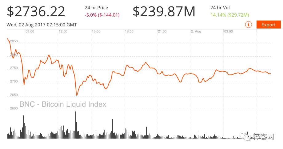 从图中可以看出,虽然早前(BCC 刚上线没多久)比特币价格出现小幅度下跌,但是目前波动水平正逐渐趋于平缓,并维持在 2700 美元上下。这同时表明,比特币与法定货币之间汇率浮动的程度变小。