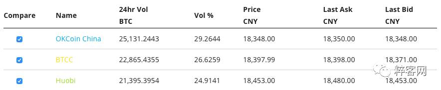 各大交易所 BTC/CNY 的交易情况