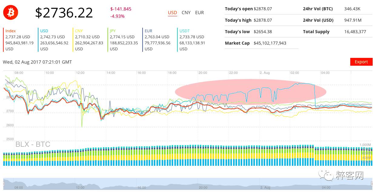不过,随着昨日美国部分交易所(比如 Kraken、Bittrex)对 BCC/BTC、BCC/USD 等交易的开放,比特币和美元之间的汇率出现了较大的浮动。