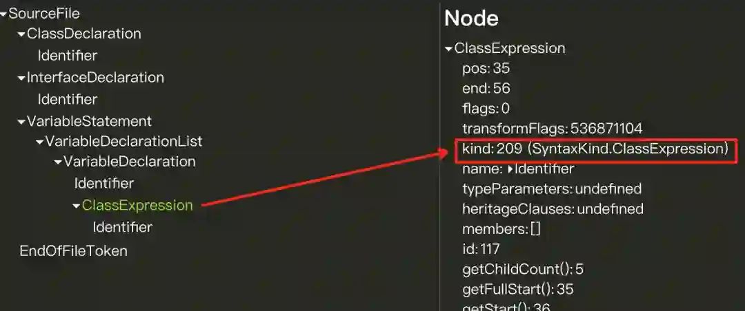 其中kind为当前节点的类型,当然Node是所有节点的基类,它的实现还包括Statement、Expression、Declaration等,回到开头这个"class-name"规则,我们的所有声明类主要是class与interface关键字,分别对应ClassExpression、ClassDeclaration、InterfaceDeclaration, 我们可以通过上步提到的AST语法树工具,在语法树中看到其为一一对应的。
