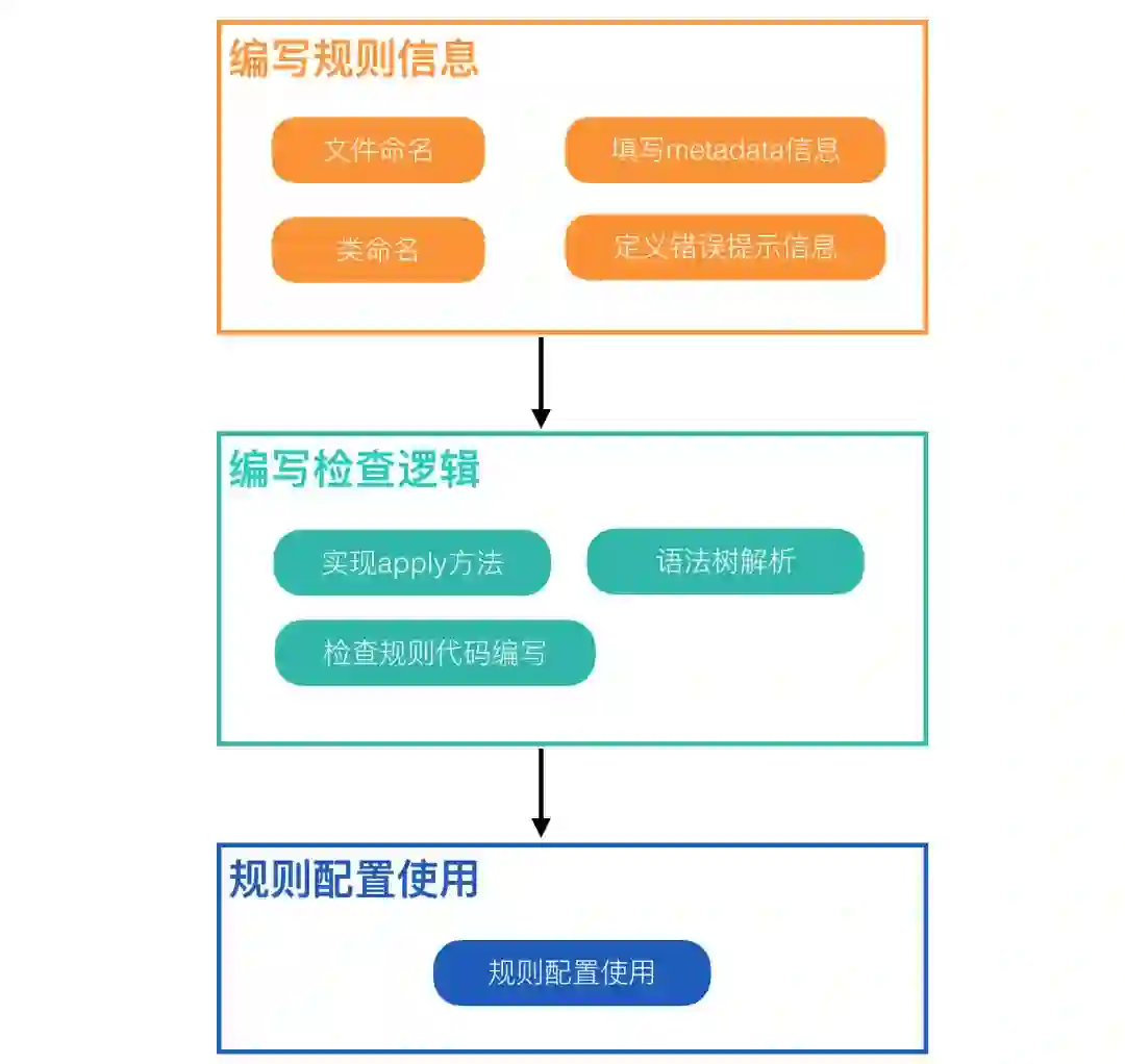 那自定义TSLint大概需要什么步骤呢,首先规则文件根据规范进行按部就班的编写规则信息,然后根据代码检查逻辑对语法树进行分析并编写逻辑代码,这也是自定义规则的核心部分了,最后就是自定义规则的使用了。