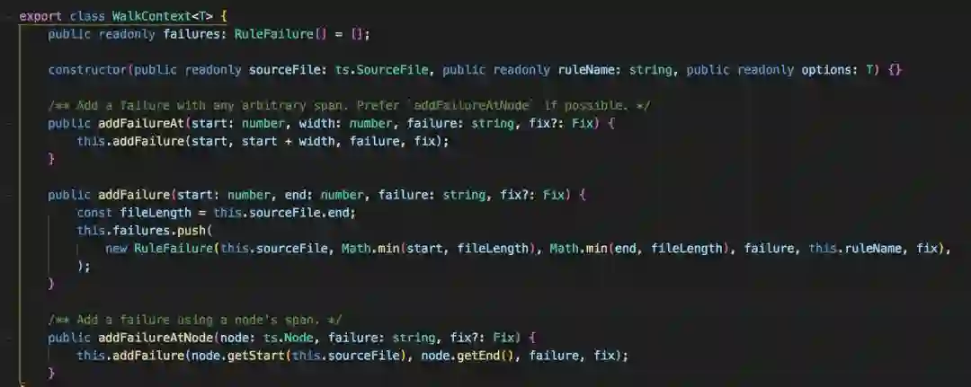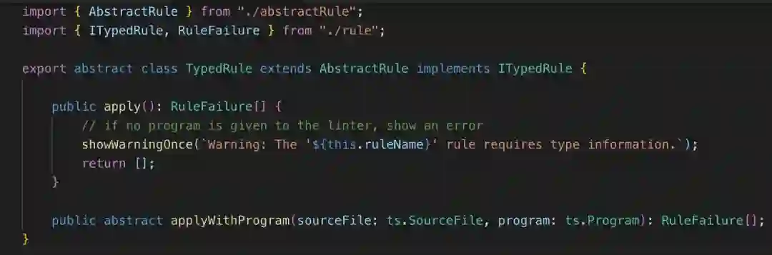 规则的类名是Rule,并且要继承Lint.Rules.AbstractRule这个类型,当然也可能有继承TypedRule这个类的时候,但是我们通过阅读源码发现,其实它也是继承自Lint.Rules.AbstractRule这个类。