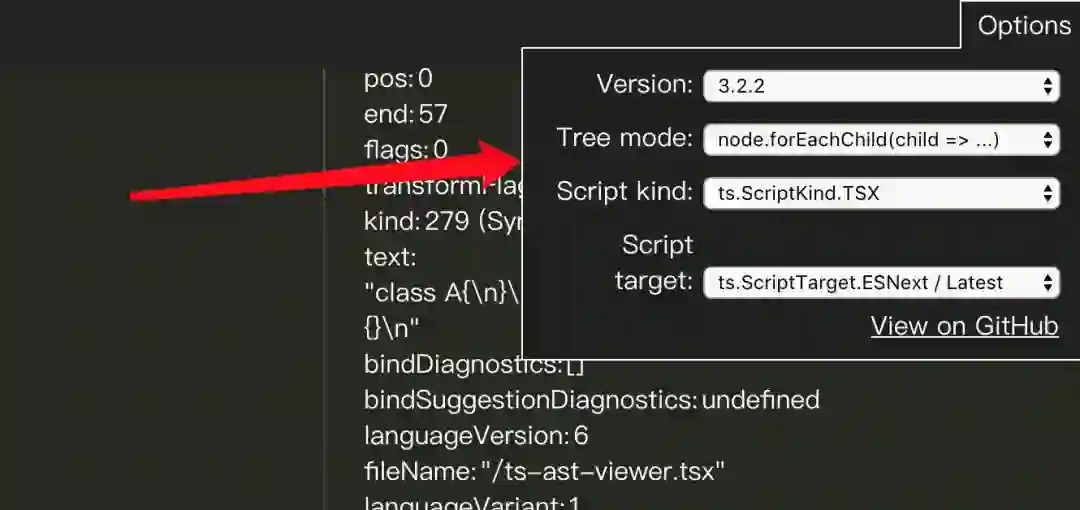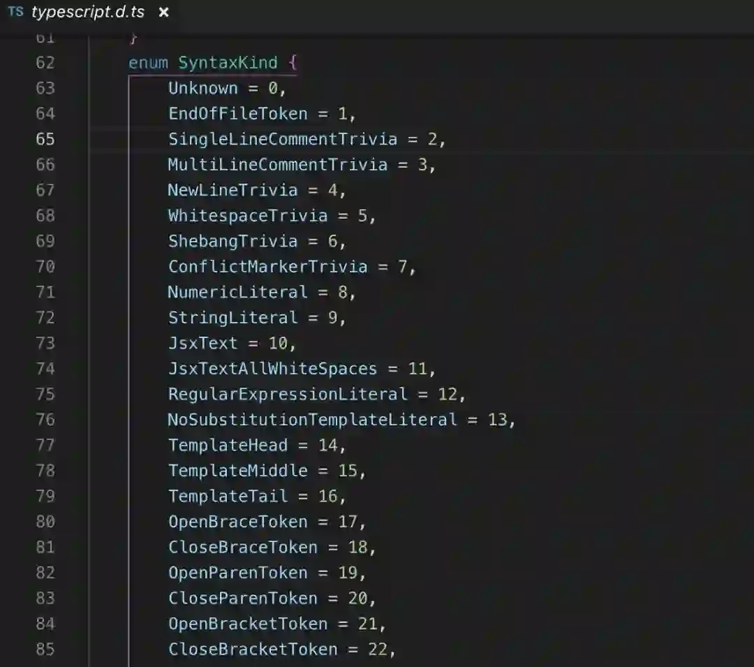 通过ts.forEachChild方法对于语法树所有的节点进行遍历,在遍历的方法里可以实现自己的逻辑,其中节点的类为ts.Node: