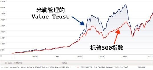 不仅仅是凡夫俗子,大神也有接飞刀接破一世英名的案例,说个美盛集团(Legg Mason)昔日明星经理 比尔·米勒(Bill Miller)的故事。米勒是个不世出的奇才,从1991年到2005年,他管理的基金连续十五年吊打标普500指数。世界上除他以外没有任何一个人曾做到过这件事——巴菲特没有,索罗斯没有,彼得·林奇也没有,世间只有米奇才做到了。据说在美国基金界每年大概只有1/4的股票型基金能击败标普,如果某一个在位15年的基金经理想要纯粹靠运气来完成米勒的不世之功,那么这概率就是1/4的15次方,等于一百亿分之九。