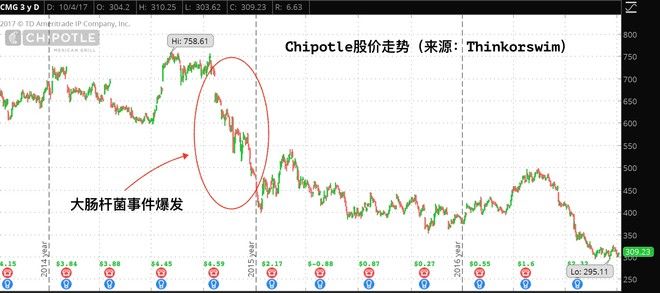 投资餐饮就要投在疯狂开店疯狂扩张的时间节点上,既然错过了女神那我就只好作罢,谁让自己没眼光。我是打死也不会去追一个已经结束快速扩张的市盈率60倍的餐饮股的。而后来就发生了震惊美国餐饮界的大肠杆菌事件。
