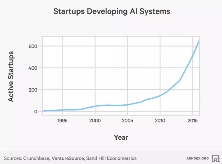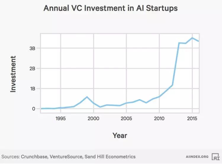 从2000年至今,美国人工智能行业的创业公司数量增加了14倍,从47个增至649个。去年,风投对这一领域的投资金额猛翻6倍,达到35亿美元。