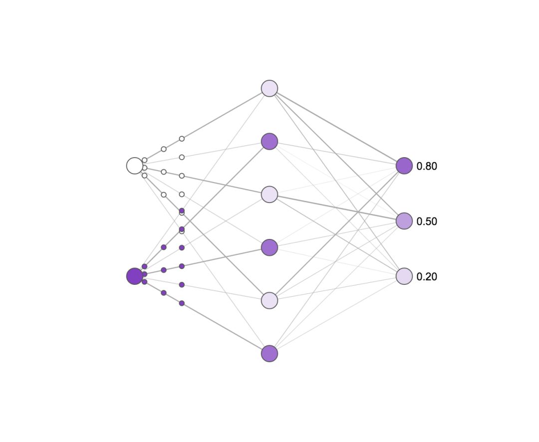 删除神经元对简单神经网络影响的直观图示。颜色较深的神经元更加活跃。尝试点击隐藏层中的神经元并删除它们,观察输出神经元的活动会如何改变。请注意,删除一个或两个神经元对输出影响很小,而删除大部分神经元则会对输出影响很大,并且一些神经元比其他神经元更重要!