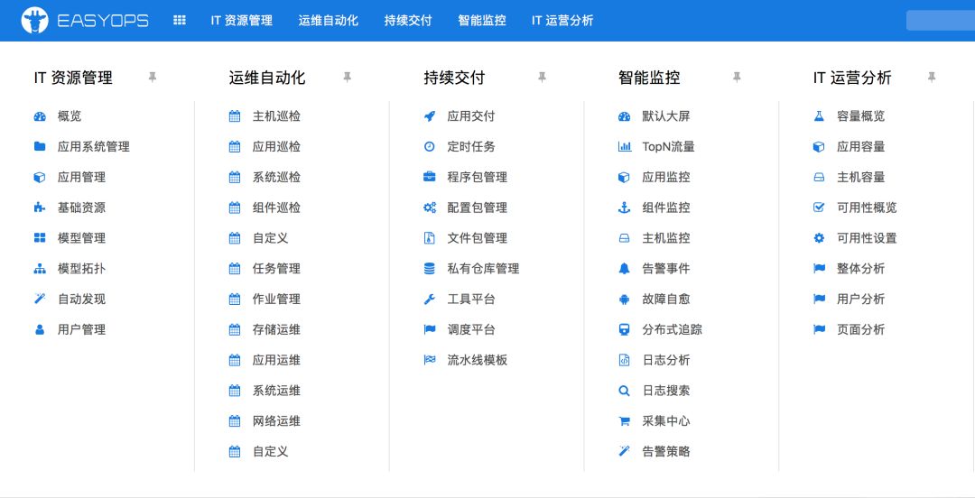 EasyOps产品五大模块对于IT运维管理能力的着力点各有不同: