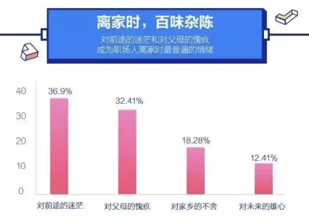 2 月 18 日,互联网招聘平台 BOSS 直聘发起了「2019 职场人春节离家心态调查」。调查显示,有 36.9% 的职场人在离家时对未来忧心忡忡,有 32.41% 的职场人在心中泛起对父母的愧疚。4 成职场人表示陪伴家人比工作更重要。同时,超过 7 成的职场人认为离开家乡得到了更好的生活。