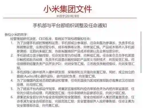 2 月 18 日,小米集团发布内部邮件,宣布手机部和平台部组织调整:手机部成立参谋部,任命朱磊为参谋长,负责手机业务销售运营、业务运营分析等业务;手机部成立显示触控部,核心器件部并入硬件研发部;原集团安全部拆分为安全合规部和安全管理部。