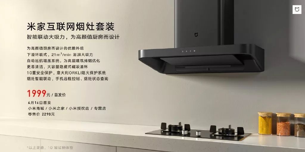 号称专为高颜值厨房设计的米家胡丽拦网烟灶套装,采用了一体化无缝机身大圆角设计。一体化无缝机身,下潜式环吸,支持烟灶智能联动,售价 2298 元。此售价同时包含抽油烟机和燃气灶,6.16 日首发价格 1999 元。