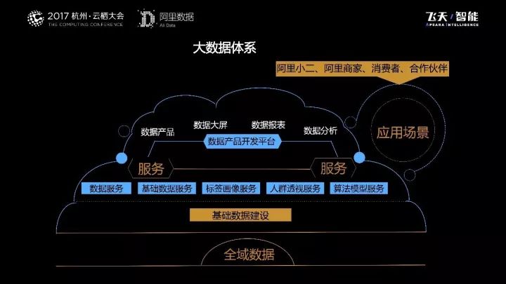 从图中我们也可以发现,我们的数据产品和服务,实际上是通过各类不同的应用场景来达到服务阿里小二、阿里商家、消费者、合作伙伴的目的。