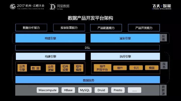 在应用和服务中间是DSL,所有的应用和服务,最终都会按照DSL标准来配置。通过数据产品开发平台构建完成的应用和服务,并不是一个独立运行的实体,它实际上是一个配置,渲染引擎、执行引擎等可以加载和运行这个配置;通过构建引擎生成一个配置,来实现不同国家、不同机房、不同终端都能运行的目的。