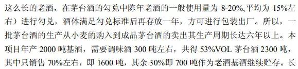 资料五:在一篇硕士论文(作者为茅台待了十几年的老员工)《2010年新增2000吨茅台酒技改工程投资可行性研究分析》中,可以查到的相关信息显示(参见下面两图),使用的调味酒(前注:调味酒为酒龄大于 15 年的陈老酒)大约占到基酒的15%,按照这里的说法,2000吨基酒(2000吨为设计产能)需要300吨调味酒。