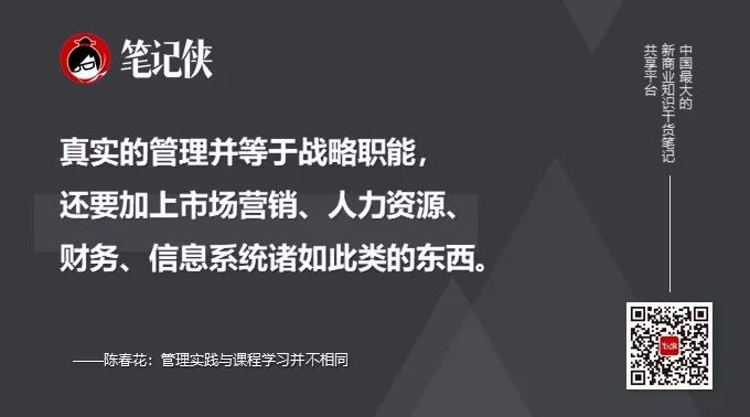 因为管理实践与课程学习并不相同,真实的管理并不是等于战略职能,还要加上市场营销、人力资源、财务、信息系统诸如此类的东西。