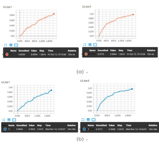 ResNet50-on-ImageNet训练收敛曲线(曲线上的精度为训练集上的精度):(a)所对应的模型在验证集上Top-1 精度≥75%,训练耗时为10分06秒;(b) 所对应的模型在验证集上Top-5精度≥93%,训练耗时为10分28秒。