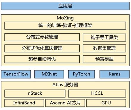 在模型训练部分,ModelArts通过硬件、软件和算法协同优化来实现训练加速。尤其在深度学习模型训练方面,华为将分布式加速层抽象出来,形成一套通用框架——MoXing(“模型”的拼音,意味着一切优化都围绕模型展开)。
